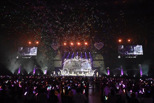 さらに=LOVEは、ユニット曲である「わたし、魔法使い」をメンバー全員で歌唱。彼女たちが衣装と楽曲の世界観にマッチしたハート型のペンライトを手に歌っている最中、ステージの前方からカラフルな銀テープが勢いよく何発も放たれ、会場を鮮やかに彩った。幕間映像を挟み、ファンから人気の高い楽曲「しゅきぴ」が始まると、耳や尻尾が付いた衣装に着替え、猫に扮した=LOVEがステージに登場。そのかわいらしい姿に客席からひと際大きな歓声が沸き起こる。「Want you!Want you!」の終盤には、ピンク色の風船が大量に客席へ降り注ぐ大規模な演出が。会場が瞬く間にメルヘンで幻想的な空間に様変わりした。