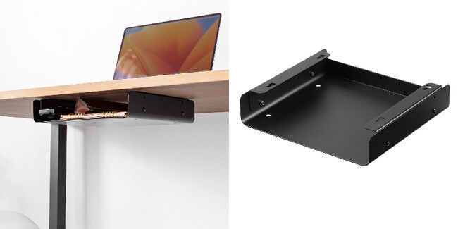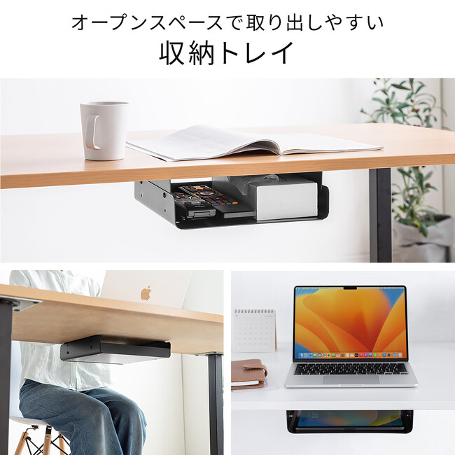 本製品は、既存のデスクにタッピングボルトで簡単に取り付けができるデスク下収納トレイです。引き出しや収納が少ない昇降デスクや、在宅ワークでのスペース拡張、リビングデスクでの小物収納などに最適です。
