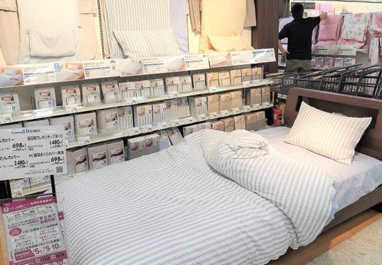 寝具とルームデコレーション、家具、収納の売場です。寝具では、質の高い睡眠を追い求めるブランド「エアウィーヴ」を導入しました。最新型測定器(マットレスフィット)で、それぞれの体形や体格によって最適な硬さの組み合わせの提案を行い、ゆったりとお試し、寝比べをしていただけます。寝具のカバーリングは、コーディネートしやすくするために、カラー別にわかりやすく陳列しています。