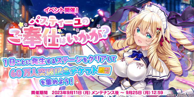 合同会社EXNOA(本社:東京都港区、CEO:村中 悠介、URL:https://games.dmm.com/)が運営するDMM GAMESにおいて、『救世少女 メシアガール おかわり』の累計登録者数が60万人を突破し、本日9月11日(月)より、「60万人突破記念キャンペーン第1弾」およびストーリーイベント「パスティーユのご奉仕はいかが?」を開催することをお知らせいたします。