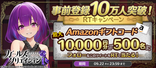 『ガ―ルズクリエイション』事前登録者数10万人突破を記念して、Amazonギフトコード最大10,000円分が抽選で500名様に当たるRTキャンペーンを開催いたします。