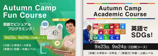 英語学習者は、プログラム内容により「Autumn Camp Fun Course」「Autumn Camp Academic Course」の2つのコースから選ぶことができます。本コースは、2022年5月に開催されたGolden Week 3day courseの人気を受け、2日間バージョンとして復活します。