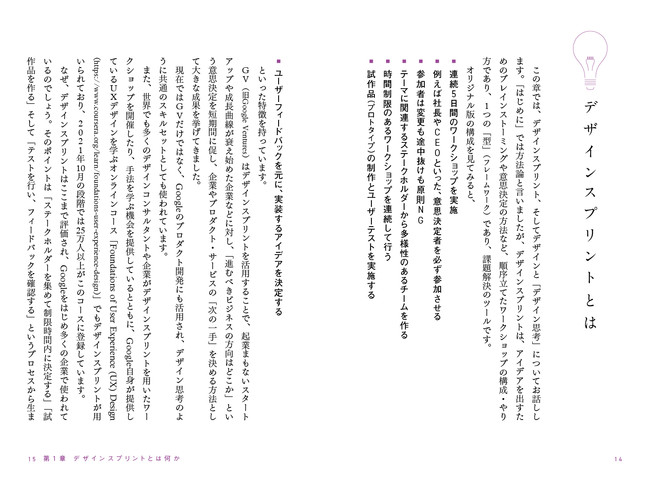 著者がこれまで学んできたデザイン思考・デザインスプリントのメソッドに、アジアの文化や考え方を加えたデザインスプリントの始め方・進め方を丁寧に解説しています。また、リモート環境下での効果的なやり方や、目的や日程に合わせたカスタマイズ法も紹介しています。