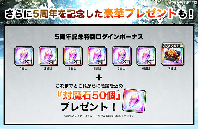 7日間ログインするとプレミアム11連ガチャチケットが入手できる5周年記念ログインボーナスの実施と、5周年の感謝を込め対魔石50個をプレゼントいたします。