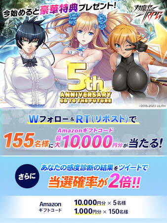 5周年を記念して、最大10,000円分のAmazonギフトコードが抽選で155名様に当たるWフォロー&RTキャンペーンを開催いたします。さらに「あなたの感度診断」の診断結果をシェアすると当選確率が2倍になります。診断には「アサギ」を始めとする『対魔忍RPG』の魅力的なキャラクターが多数登場します。中には感度3000倍を超えるレアな診断結果も…!?