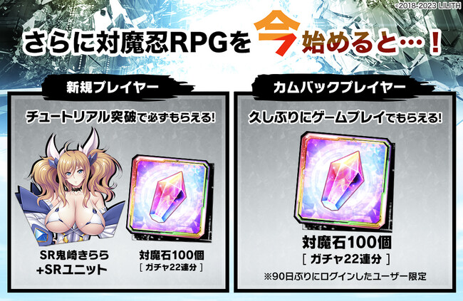 ・キャンペーンの対象者は、上記期間中に新規に『対魔忍RPG』のプレイ開始された方となります。