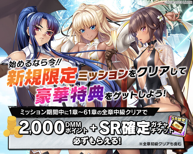 ■始めるなら今!新規限定ミッション達成で2,000DMMポイントとSR確定ガチャチケットが“必ず”貰える!