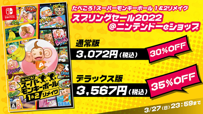 株式会社セガは、好評発売中のNintendo Switch(TM)版『たべごろ!スーパーモンキーボール 1&2リメイク』について、2022年3月18日(金)よりニンテンドーeショップにて「スプリングセール2022」を実施します。