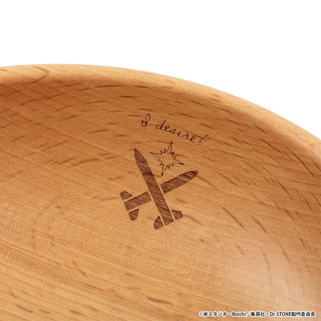 ラウンドディッシュには「三角フラスコ」や「すり鉢」のモチーフと千空の決め台詞『唆るぜ これは』を英字で刻印しました。