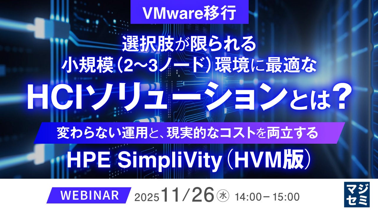 マジセミ株式会社は「【VMware移行】選択肢が限られる小規模(2~3ノード)環境に最適なHCIソリューションとは?」というテーマのウェビナーを開催します。