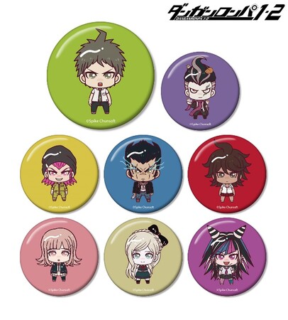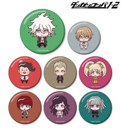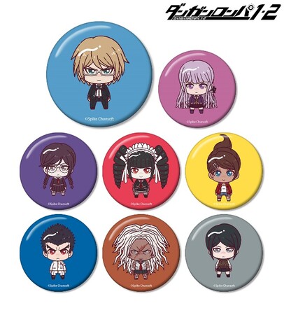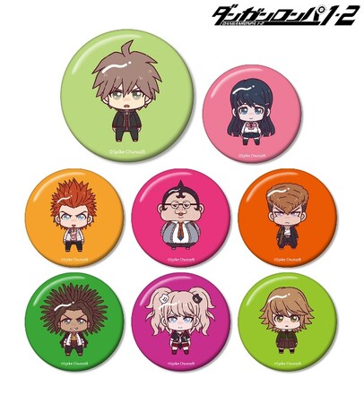 日向創、田中眼蛇夢、左右田和一、弐大猫丸、終里赤音、七海千秋、ソニア・ネヴァーマインド、澪田唯吹がちょこんと立っているちびキャラを新たに描き起こし、缶バッジに仕上げました。