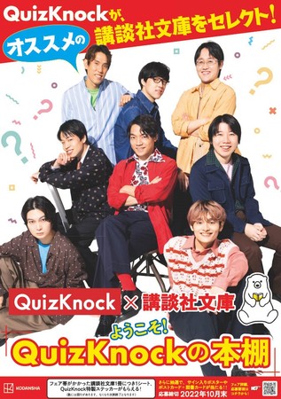 講談社文庫の2022年夏フェアは、公式YouTubeチャンネルの登録者数が189万人(2022年8月現在)をほこるQuizKnockとのコラボが実現!! 題して「QuizKnock×講談社文庫 ようこそ! QuizKnockの本棚」です。メンバーがあなたにオススメの講談社文庫を3冊ずつ選書! 講談社文庫のキャラクター・よむーくのオススメ書目と併せて全国書店にて大展開いたします。