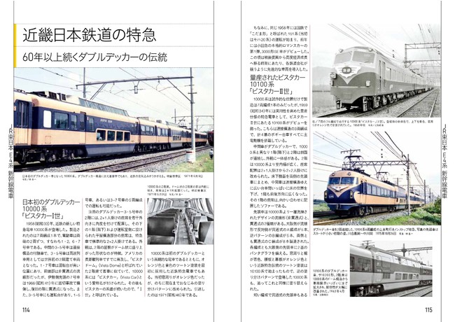 1958年に登場した近鉄10000系「ビスタカー」から始まる日本のダブルデッカー車。本章ではテーマを設けて、各ダブルデッカー車が登場した背景、車両の詳細などを解説しています。