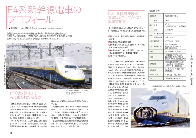 「E4系新幹線電車のプロフィール」では、E4系のコンセプト、メカニズム、内外装などを解説。E1系の経験と技術の進化が、E4系を完成度の高い車両に仕立て上げたことが分かります。