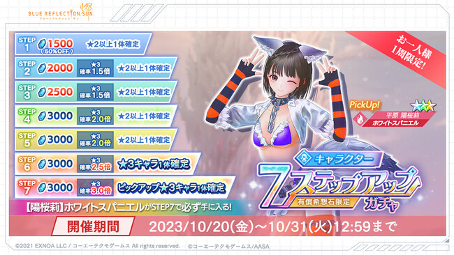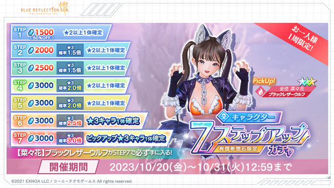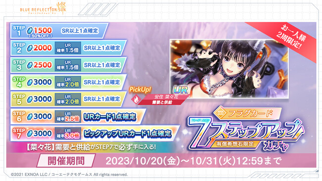 有償希想石で10連ガチャを引くごとにSTEPが1つアップ!STEP7では、それぞれのガチャで★3キャラクター/URフラグカードの出現確率が3倍になるほか、ピックアップ★3キャラクター1体/URフラグカード1枚が確定でゲットできます!