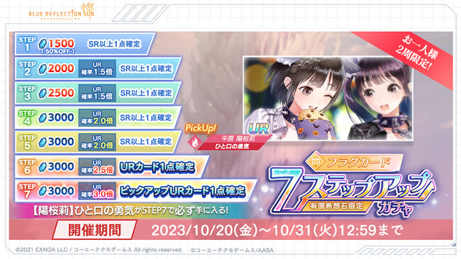 キャラクターステップアップはSTEP7まで引き終わった時点で、フラグカードステップアップは14回(2周目のSTEP7まで)引き終わった時点で終了となります。
