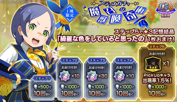 内容:期間中1周限定で引くことができる、「【魔獣召喚の奇術】ステップガチャ」を開催します。ステップ1では「魔法石500個」で10回ガチャを引くことができ、ステップ2・3・4では「【魔獣召喚の奇術】メィリィのかけら」、ステップ5ではピックアップキャラの出現率が1.5%&記憶結晶「綺麗な色をしていると思ったの★3」のおまけ付きのお得なガチャです。
