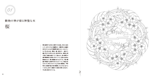 本作は季節の花々をモチーフに作成。春夏秋冬を代表する花を基本に、動物などを加えて楽しく華やいだイメージで描きました。桜や藤といった日本を代表する花、熱帯地方で目にする個性的な花、ボタニカルアートのように緻密に表現された花などを、季節の移ろいが感じられるような順番で構成。さらに、食用花やきのこ、ハーブなども採用しています。