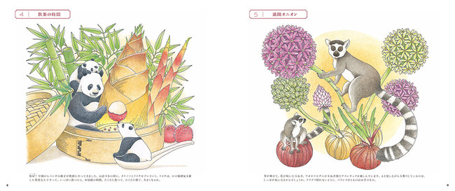 絵は全21点で、それぞれ着彩画と線画を収録しています。ブタや牛がのびのび過ごすプランターの中の小さな牧場や、スワンボートデートをするマレーグマなど、メルヘンでかわいい絵がいっぱいです。