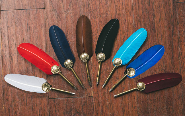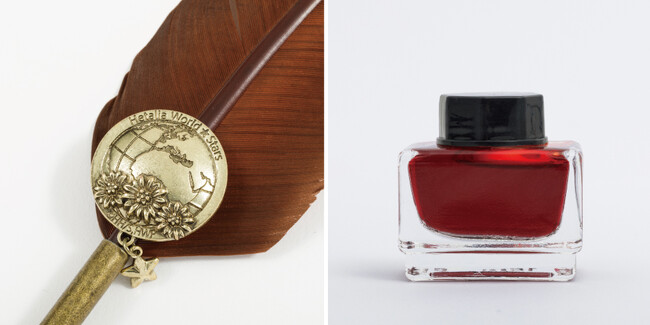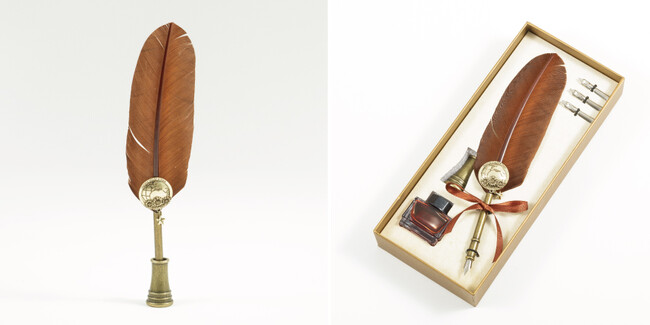 付け替えのペン先、羽根ペンを立てる台座も付属。