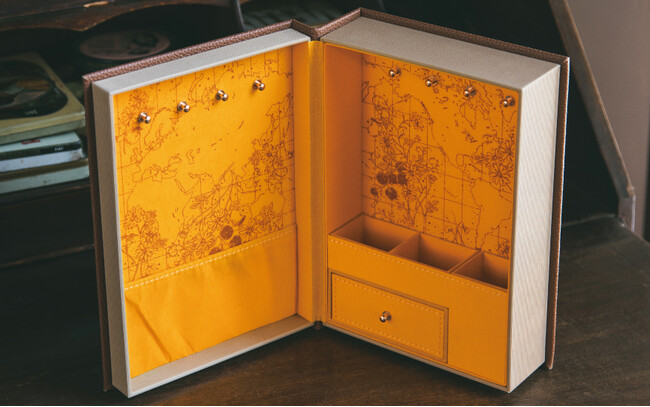 左側の大きなポケットにはポストカードやメモを入れたり、上の金具部分にネックレスを掛けて仕舞うことも。