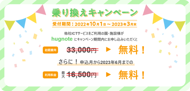 「hugmo(ハグモー)」は、ICTを活用した園業務支援ならびに保護者とのコミュニケーション(hugnote)をはじめ、園児の健康管理(hugsafety)、バス位置情報通知(huglocation)、写真販売(hugphoto)、商品販売(hugselection)など幼保園施設等の運営に関わる様々な機能を1つのサービスとして総合的に提供する保育ICTサービスです。今回の「乗り換えキャンペーン」では、他社の保育ICTサービスをご利用中の幼稚園・保育園・施設等が新規に「hugnote」にお申し込みいただいた場合、初期費用のみならず2023年6月末までのサービス月額利用料も無料にいたします。この機会にぜひ「hugnote」にお申し込みください。