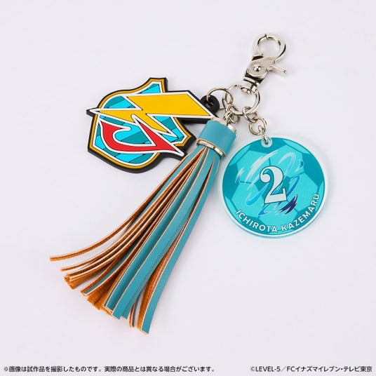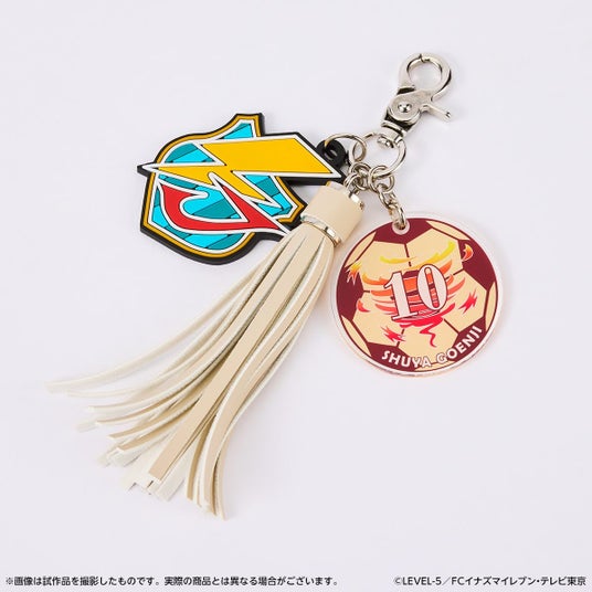イナズマジャパンのエンブレムをデザインしたラバーパーツと各キャラクターの必殺技をイメージしたアクリルパーツとタッセルパーツの3つを組み合わせた商品です。