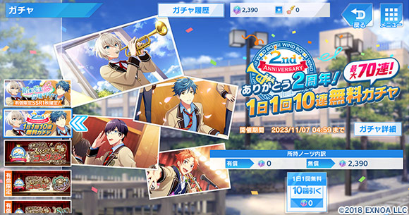 11月15日(水)のゲーム2周年を記念して2023年10月31日(火)より、1日1回10連無料ガチャを開催中です。ぜひこの機会にゲームをプレイしてください。