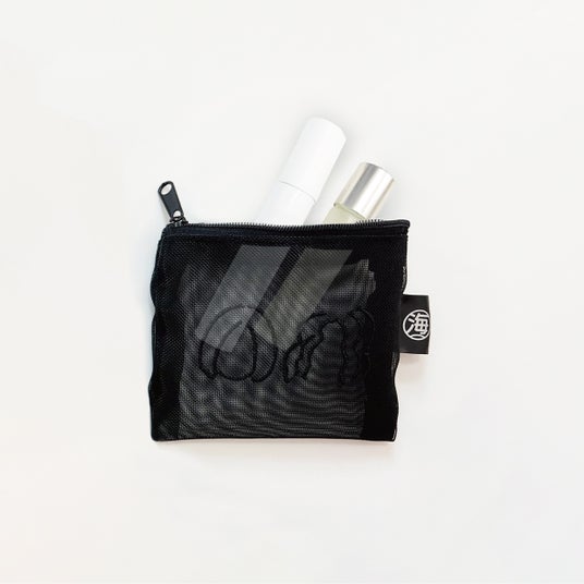 YASUTOMO COLLECTIONのロゴが刺繍された、メッシュ素材のポーチ。