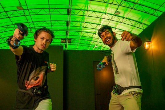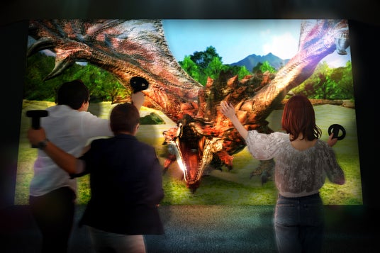 参加者は、討伐エリアの中で、アクションコントローラーとトラッキング端末を身に付けた状態で画面上のリオレウスと対峙し、全身を使って武器を操り、攻撃を回避しながら討伐成功を目指します。