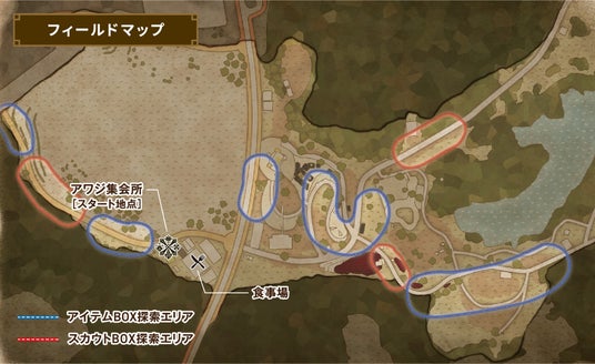 「フィールド探索」では、「大型モンスター討伐」の訓練・準備として、敷地面積約13万平方メートル のエリアに点在するアイテムBOXから必要なアイテムを採集、モンスター討伐を手助けしてくれる「オトモアイルー」のスカウトにも挑戦。