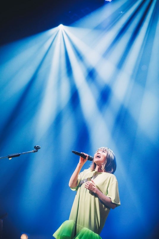 「ただいま~! 今日は皆さんから事前にリクエストを募った参加型ライブです。25年間の集大成のようなライブをお届けしようと思っています!」と、アコースティックギターを手に気持ち良さそうに歌い上げた「Ring my bell」に続いて、「2000年5月、この曲でインディーズデビューして、私の音楽人生の全てが始まりました」と「How?」を。25年の旅路で巡り会った多くのファンを前に、原点の地で改めてキャリアの出発点となった楽曲が歌われた光景は何とも感慨深い。その心地良い余韻のまま、「i can fly」が壮大なスケールでホールに広がっていく。