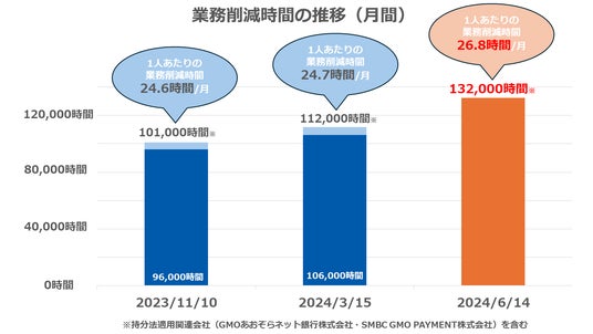 その結果、グループ全体で約13万2,000時間/月(前回調査差+約2万時間)の業務時間削減が実現しました。過去の調査も踏まえ、2024年上半期で約67万時間削減したと推定しています。(※1)