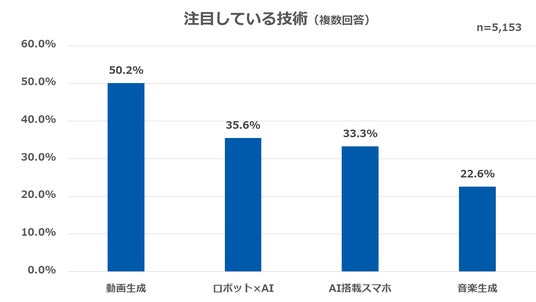 - 現在注目している技術については、「動画生成」が50.2%と約半数となり、次いで「ロボット×AI」35.6%、「AI搭載スマホ」33.3%、「音楽生成」22.6%となった。