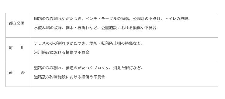 MCRによる投稿の対象となる施設の損傷・不具合(例)は以下のとおりです。