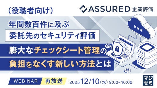 マジセミ株式会社は「【再放送】(役職者向け)年間数百件に及ぶ委託先のセキュリティ評価、膨大なチェックシート管理の負担をなくす新しい方法とは」というテーマのウェビナーを開催します。