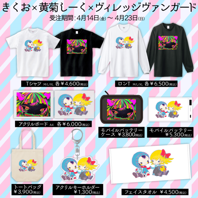 今回のコラボの為だけにイラストレーター【黄菊しーく】にグッズイラストを描き下ろしていただきました!!とても可愛いデザインとなっております。2023年4月14日(金)よりヴィレッジヴァンガードオンラインストアにて発売開始!期間内であれば必ず手に入る受注販売ですので、是非ご利用ください!