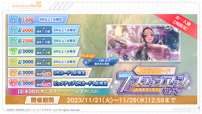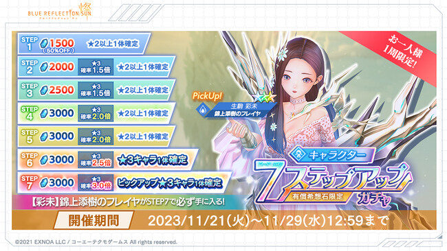 有償希想石で10連ガチャを引くごとにSTEPが1つアップ!STEP7では、それぞれのガチャで★3キャラクター/URフラグカードの出現確率が3倍になるほか、ピックアップ★3キャラクター1体/URフラグカード1枚が確定でゲットできます!
