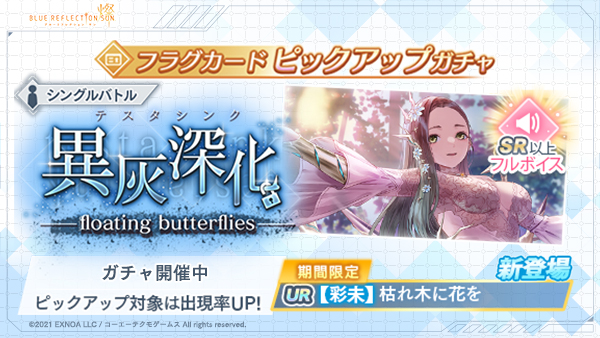 合同会社EXNOA(本社:東京都港区、CEO:村中 悠介、URL:https://games.dmm.com)が運営するDMM GAMESは、スマートフォン/PC向けヒロイックRPG『BLUE REFLECTION SUN/燦』にて、新イベント「異灰深化 -floating butterflies-」を開催したことをお知らせいたします。