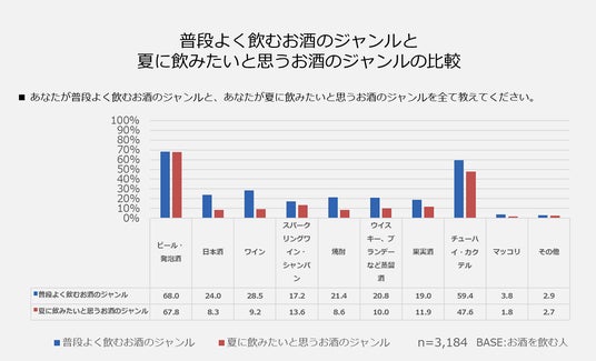 「ビール・発泡酒」と「チューハイ・カクテル」が、季節を問わず圧倒的な人気を誇っています。普段の飲酒では、この2ジャンルに続いて「ワイン」が28.5%で3位となりました。