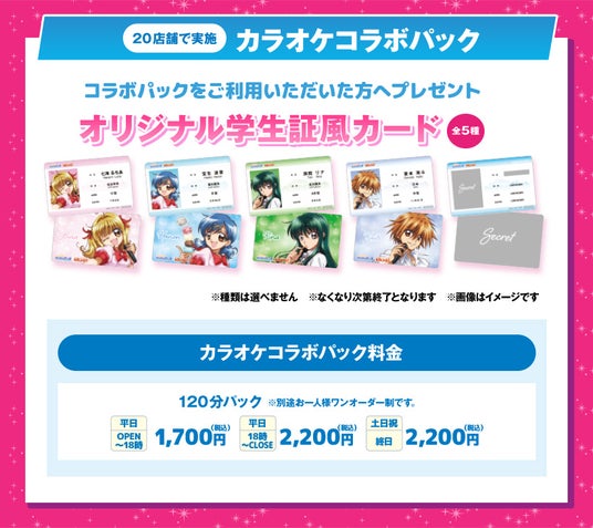 カラオケパックご利用1名ごとに、オリジナル学生証風カード[全5種]をランダムで1枚プレゼントいたします。