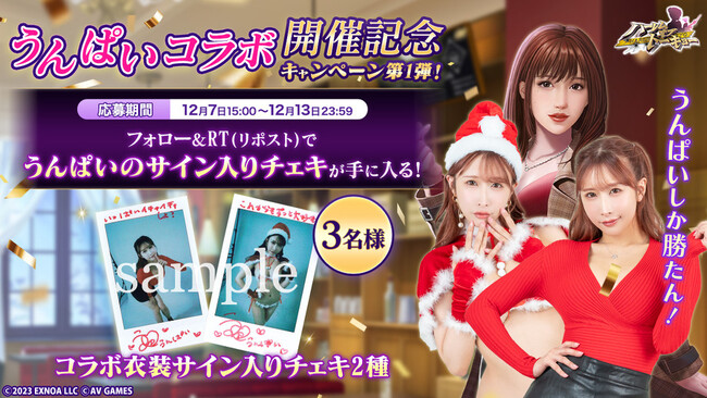 人気セクシー女優のうんぱいさんとのコラボレーションを記念して、ゲーム内に登場する衣装を着用したサイン入りチェキが抽選で各3名、合計6名様に当たるキャンペーンを実施いたします。