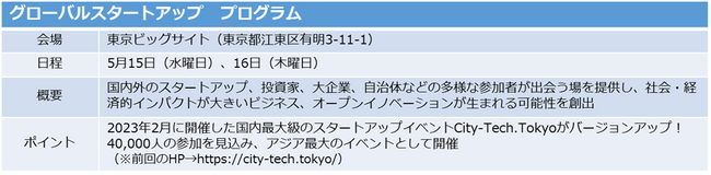 概 要:東京都は2022年11月、スタートアップ戦略 “Global Innovation with STARTUPを発表し、「東京発ユニコーン数」「東京の起業数」「東京都の協働実践数」について、それぞれ5年で10倍を目指す「未来を切り拓く10×10×10のイノベーションビジョン」を掲げ、多様な取組を展開しています。令和5年(2023年)2月には、日本最大級のグローバルスタートアップイベント「City-Tech.Tokyo」を、東京国際フォーラムにて開催し、2日間で延べ2.6万人が参加しました。次回はSusHi Tech
