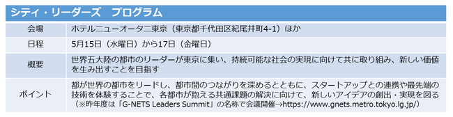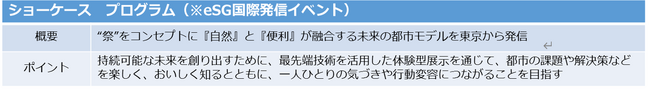 イベント概要:世界共通の都市課題解決に向けた東京発のイノベーションを創出するとともに、未来の都市モデルを発信する。以下の三つのプログラムで構成