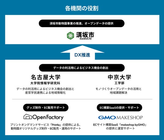 今回の協定では、GMOメイクショップが展開するECサイト構築SaaS「makeshop byGMO」のサービスを提供し、OpenFactoryの「Printio」によるプリントオンデマンドを活用したオリジナルグッズのEC販売をサポートします。オリジナルグッズの製作には、須坂市が提供する須坂市動物園のオープンデータが活用されます。デジタル技術を駆使することで、来園者だけでなく、遠方に住むファンも動物園のオリジナルグッズをECで購入できるようになります。