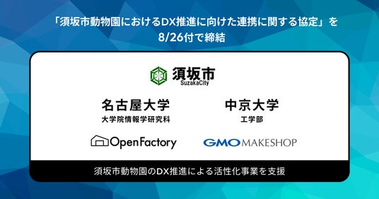 GMOインターネットグループのGMOメイクショップ株式会社(代表取締役社長CEO:向畑 憲良、以下、GMOメイクショップ)は、2024年8月26日(月)に長野県須坂市(以下、須坂市)、名古屋大学大学院情報学研究科(以下、名古屋大学)、中京大学工学部(以下、中京大学)、株式会社OpenFactory(代表取締役:堀江 賢司、以下、OpenFactory)と、「須坂市動物園におけるDX推進に向けた連携に関する協定」を締結しました。