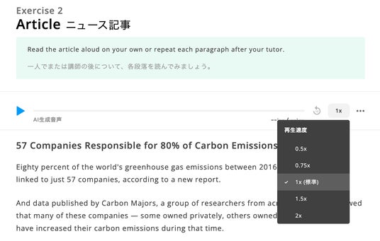「AI音声」機能を活用することで、まるでネイティブが記事を読んでくれているかのような、高品質で自然な音声を聴くことができるため、レッスン時間外でもリスニングやシャドーイングの練習ができます。
