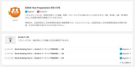 英検5級~準1級に対応し、100以上のレッスンを通し、語彙、読解、スピーキング力を鍛えることができます。
