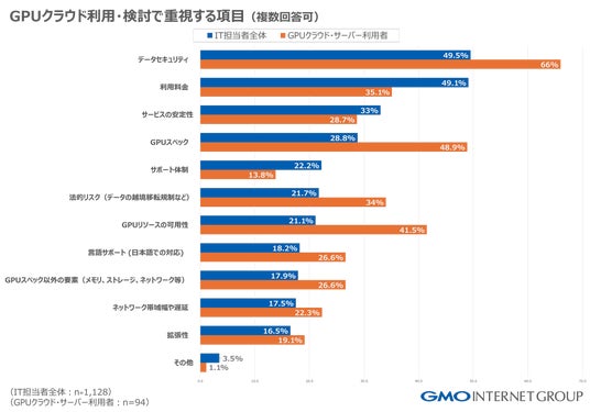 ・ IT部門担当者の49.5%が「データセキュリティ」を重視し、実際のGPU利用者では66.0%に上昇。