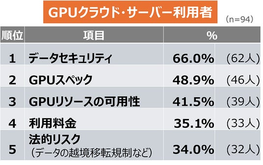 実際にGPUクラウドを利用している人の場合、「データセキュリティ」(66.0%)、「GPUスペック」(48.9%)、「GPUリソースの可用性」(41.5%)を重視する割合が高く、「利用料金」を重視するのは35.1%にとどまりました。